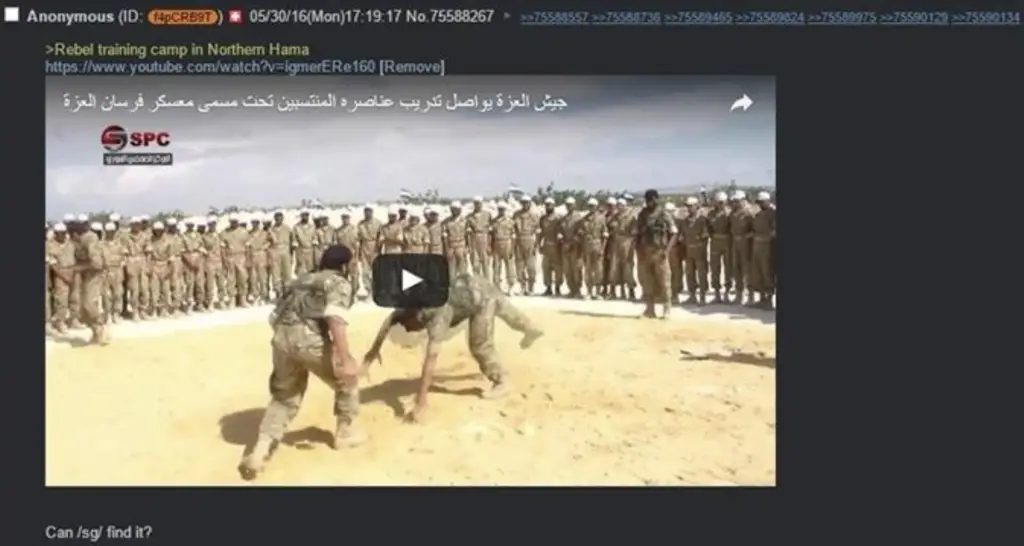 The story starts on may 30th 2016 when a user shared a YouTube video of a rebel training camp in northern Hama in Syria. The user called upon /sg/ to help find the exact location of the base in the video. /sg/ refers to Syria General, a 4chan board discussing many topics about Syria.